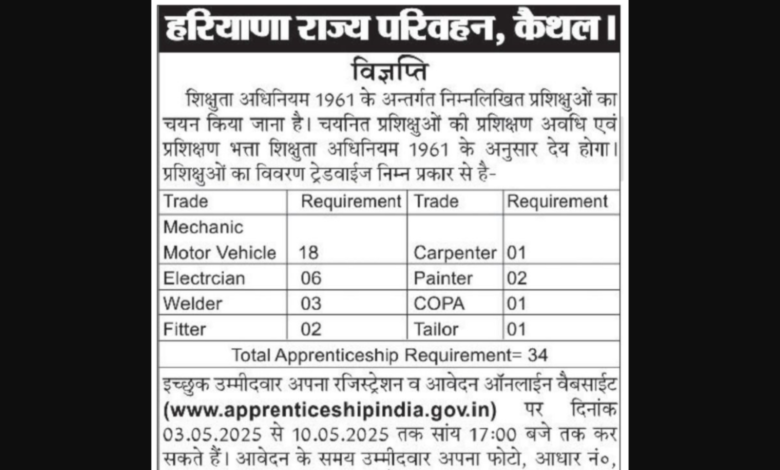 Kaithal Roadways Apprentice Recruitment 2025: The Haryana Roadways Kaithal Depot has announced the latest notification for the recruitment of Apprentice posts. A total of 34 vacancies are available under the Haryana Roadways Kaithal Recruitment 2025. The short notice was issued on 2 May 2025 , and the online application process will be open from 3 May 2025 to 10 May 2025 .